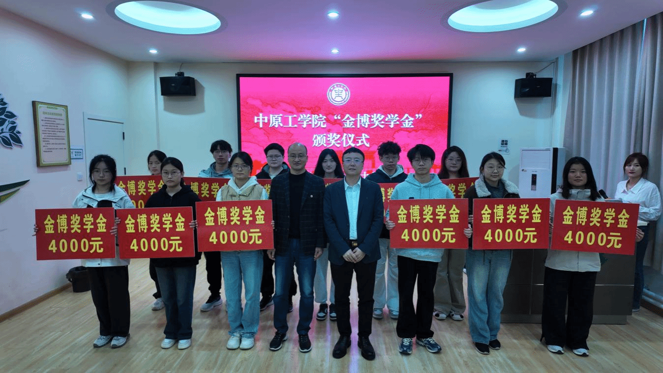 10月28日下午,中原工学院龙湖校区大学生心理健康中心内洋溢着热烈而温馨的气氛。在这充满收获与希望的季节里,2025年中原工学院“金博奖学金”颁奖仪式暨交流座谈会隆重举行。金博教育联合创始人、金博教育集团副总裁张海稳,中原工学院党委学生工作部部长、学生处处长、学生资助管理中心主任刘国存,党委学生工作部副部长、学生处副处长、学生资助管理中心副主任赵文武,“金博奖学金”全体获奖学生及经济管理学院师生代表出席了此次活动。